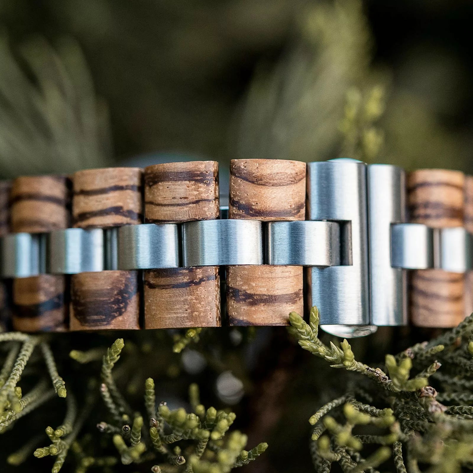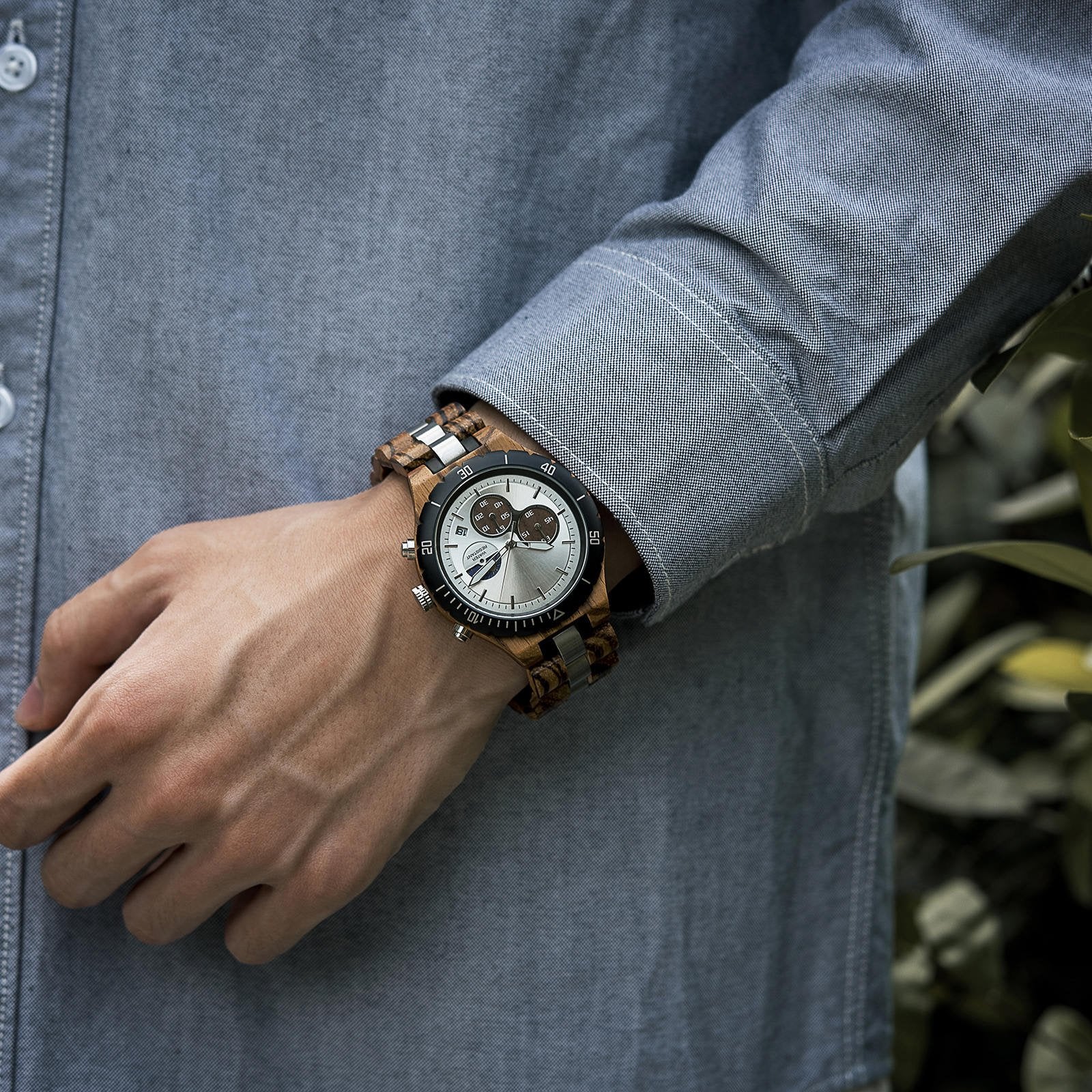 Water-resistant. Wooden case. Fashion & Casual style. Chronograph. Push button clasp. Hardlex material dial window. 12mm case thickness. Wooden band. 23mm band width. 22cm band length. 43mm dial diameter. Round case shape. Quartz movement. For Man.