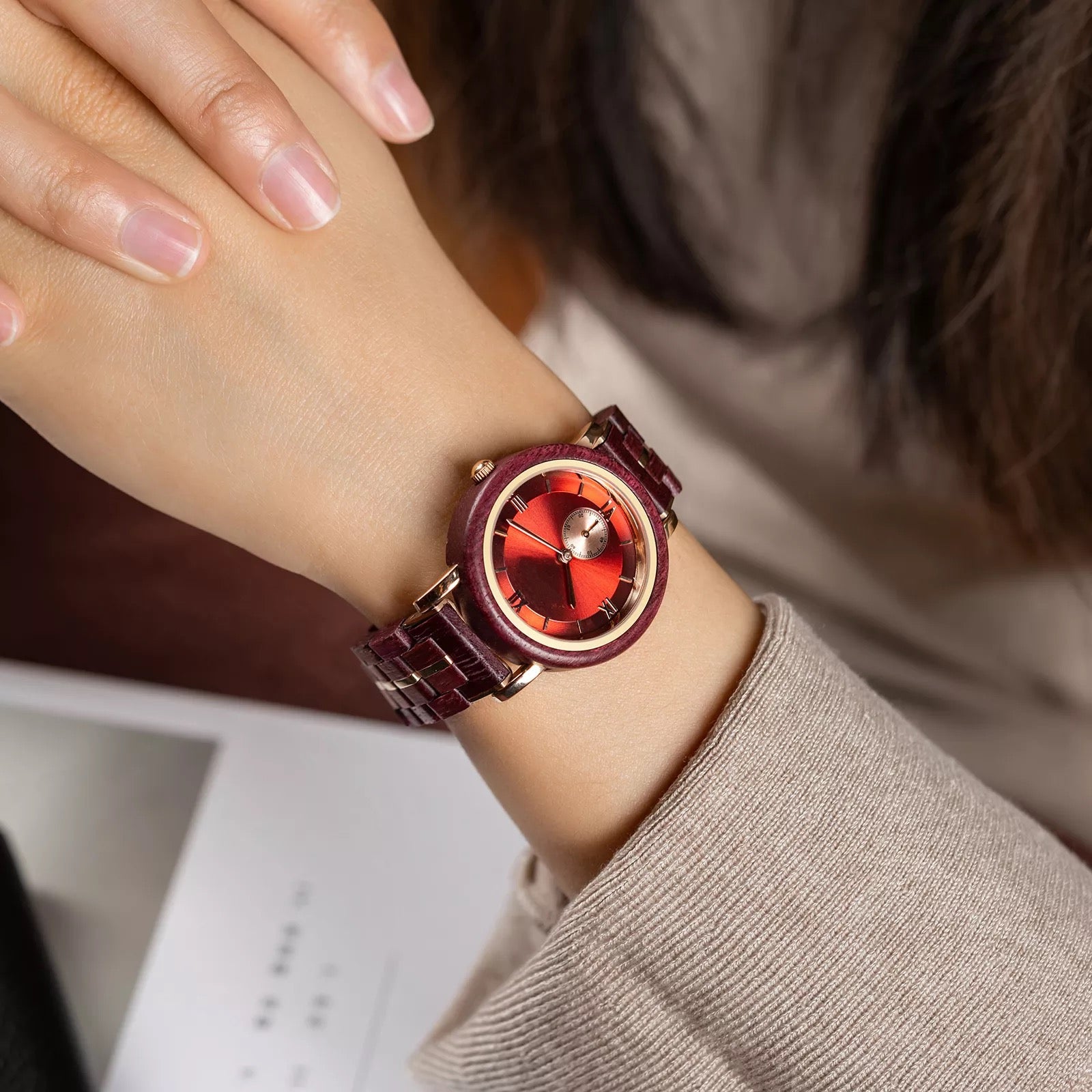 Feminine Red Round Dial Wooden Watch - For Woman
