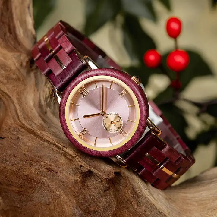 Feminine Pink Round Dial Wooden Watch - For Woman
