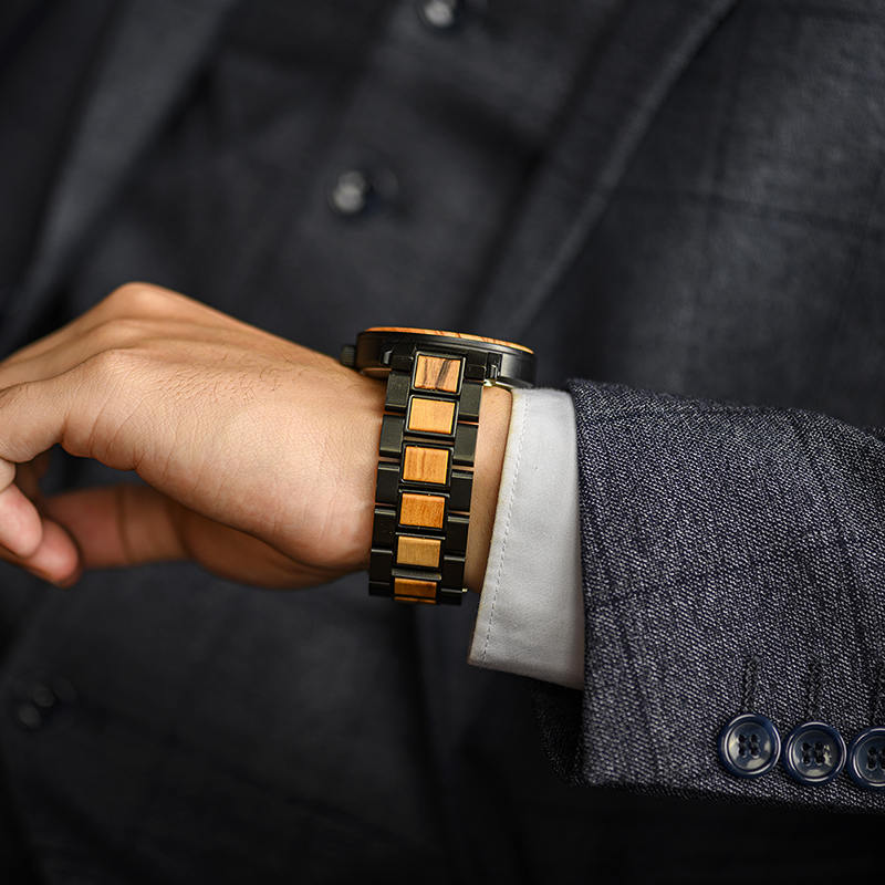 Water resistance 5Bar, push button hidden clasp, mechanical hand wind movement, 22.2cm band length, wooden case, water resistant, round case shape, 210mm band width, 12.2mm case thickness, hardlex dial window, wood box and case material, 43.7mm dial diameter, wooden band, stainless steel case material, waterproof up to 50m.