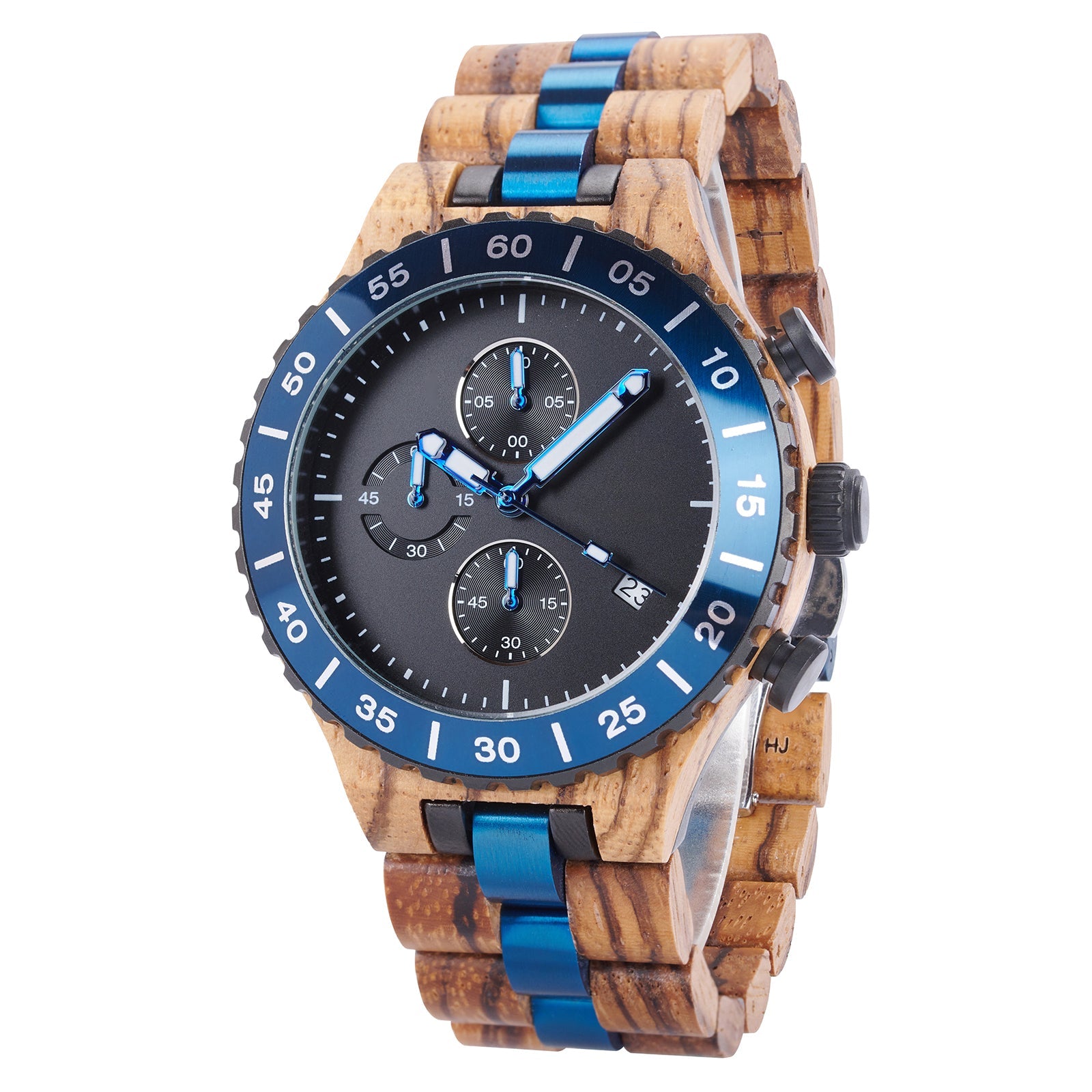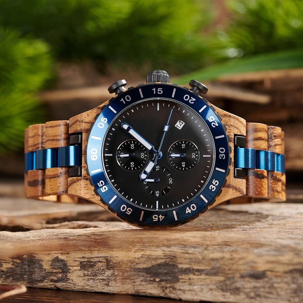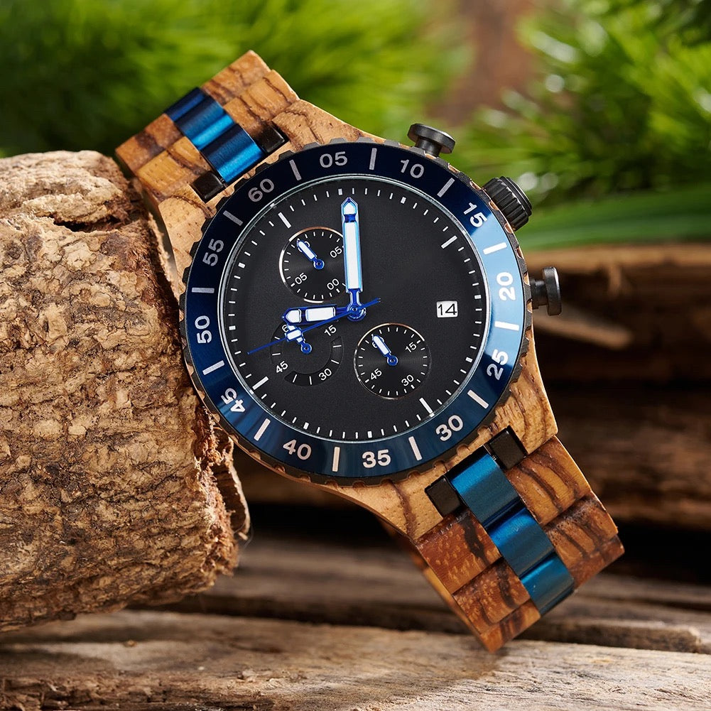 ZebraWooden Chronograph Watch For Man with Black Dial and Blue Bezel